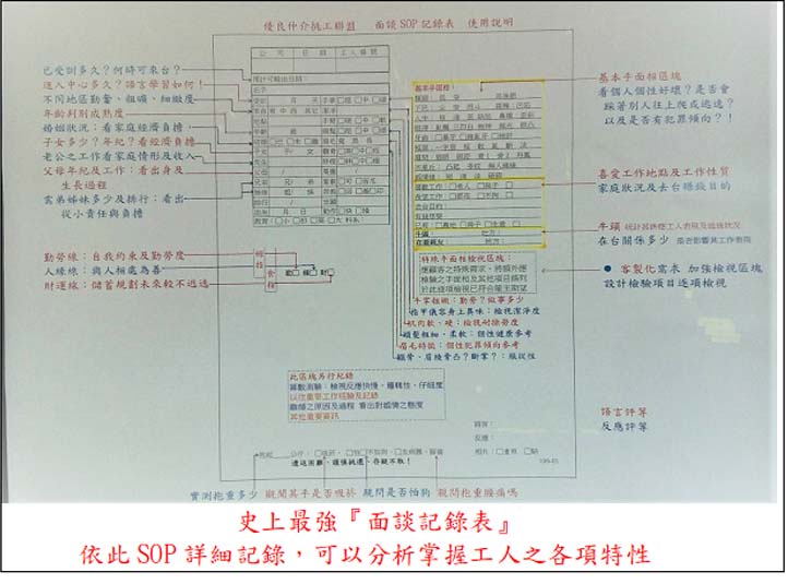 - 面談紀錄表應依不同大環境、不同國籍特性、不同市場風氣習慣、不同工種、不同層級隨時予以修正以期規避死角、陷阱,以期能為雇主挑選到絕佳人選。